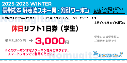 *割引クーポンのお問合せ…TEL.0263-79-2246(信州松本 野麦峠スキー場)