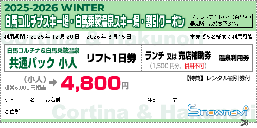 - *白馬コルチナ&白馬乗鞍温泉スキー場 共通リフト1日券と引換えが出来ます。