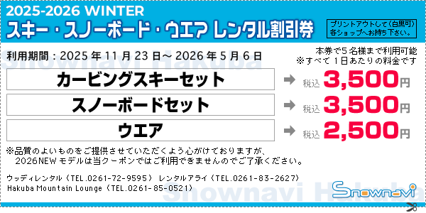*事前予約でもクーポンはご利用いただけます。各レンタルショップへのご予約の電話の際に Snownavi のレンタルクーポンを利用する旨をお伝えください。また、各レンタルショップのホームページからご予約の際は、予約フォームの備考欄等に Snownavi のクーポンを利用する旨を必ずお書き添えください。
