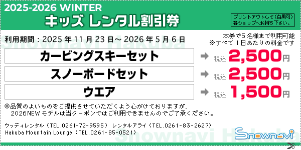 *事前予約でもクーポンはご利用いただけます。各レンタルショップへのご予約の電話の際に Snownavi のレンタルクーポンを利用する旨をお伝えください。また、各レンタルショップのホームページからご予約の際は、予約フォームの備考欄等に Snownavi のクーポンを利用する旨を必ずお書き添えください。