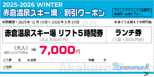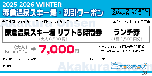 ※割引クーポンのお問合せ:TEL.0255-87-2125(赤倉温泉スキー場)
