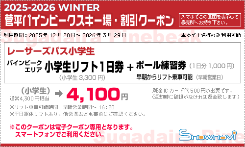 このクーポンを菅平パインビークスキー場の総合チケット売場で提示し、リフト券を購入してください。