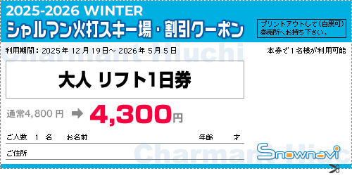 * To inquire about this coupon, please call …TEL.025-568-2244(Charmant Hiuchi Ski Area)