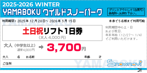 * To inquire about this coupon, please call …TEL.026-274-5959(YAMABOKU WILD SNOW PARK)