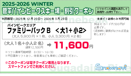 Present this coupon at the main ticket counter or the 6th ticket counter of Sugadaira Pinebeak Ski Resort to purchase your lift ticket.