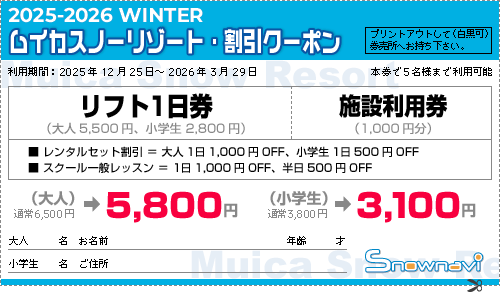 * To inquire about this coupon, please call …TEL.025-773-3311(Muica Snow Resort)